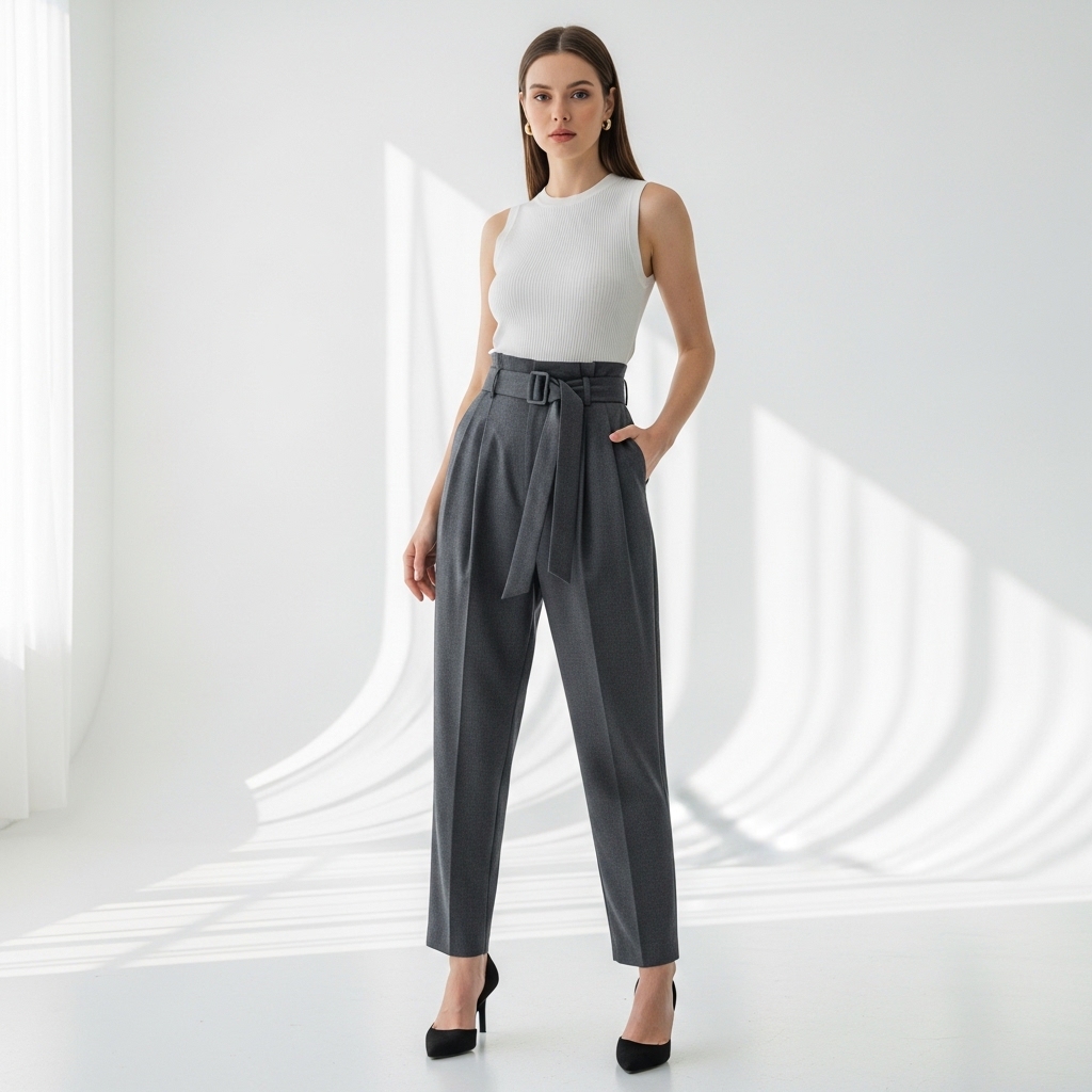 Tasarım Detayları: Yüksek bel bandı, gizli kanca ve fermuar kapama ile temiz bir ön görünüm sunar. Yanlarda derin fonksiyonel cepler, arkada ise estetik amaçlı sahte fileto cepler bulunur. Kendi kumaşından hazırlanan çıkarılabilir kemeri, beli vurgulamak için idealdir.